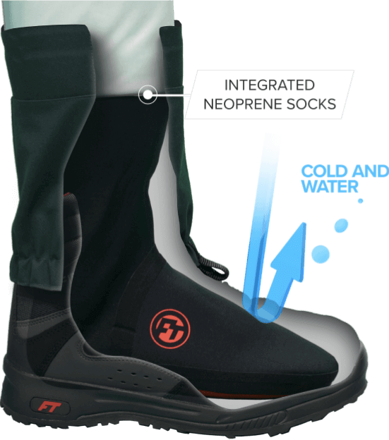 - Kalhoty jsou zakončené integrovanými 4 mm neoprenovými ponožkami se zesíleným chodidlem