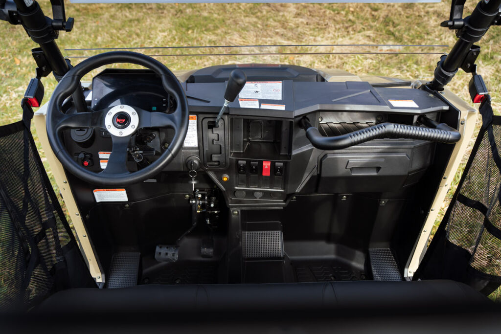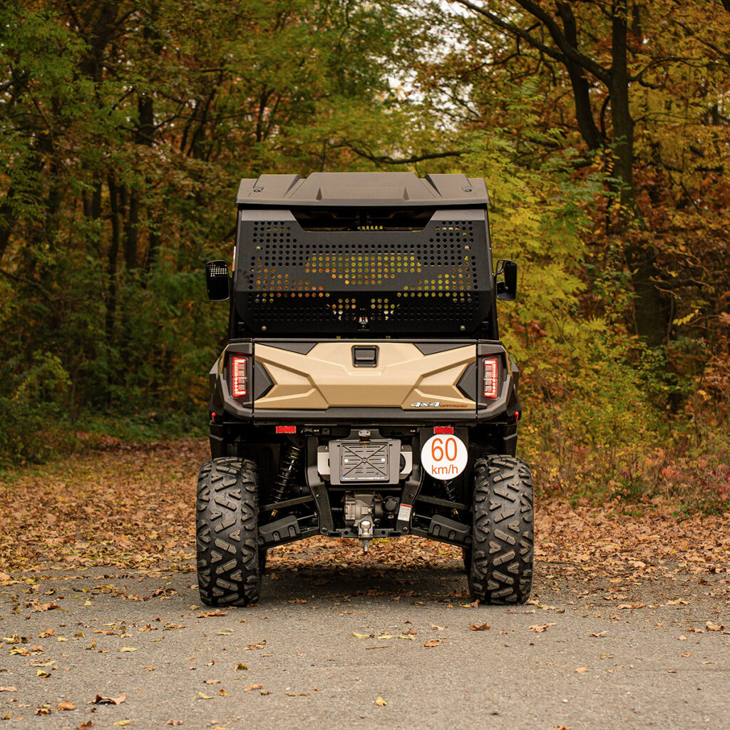Pracovní UTV E5+, kapalinou chlazený jednoválec, automatická převodovka CVTech, L/H/N/R/P, pohon 2x4 / 4x4 elektricky přepínatelný, elektrický posilovač řízení EPS, sklápěcí korba, zavěšení: nezávislá dvojitá A-ramena vpředu i vzadu, 4x hydraulická kotoučová brzda, tažné zařízení, přední ochranný rám, el. naviják 3000 lbs s dálkovým ovládáním, LED osvětlení vzadu, ALU disky