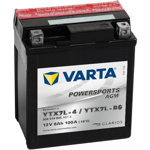 Moderní bezúdržbové baterie VARTA Powersports MF poskytují spolehlivý startovací výkon, výjimečně silnou startovací energii a robustní konstrukci, která odolává vibracím. Technologie AGM (Absorbent Glass Mat) je optimálním řešením pro zvýšené energetické nároky. Kromě lepšího výkonu při studených startech lze baterie Varta AGM montovat pod úhlem až 45 stupňů.